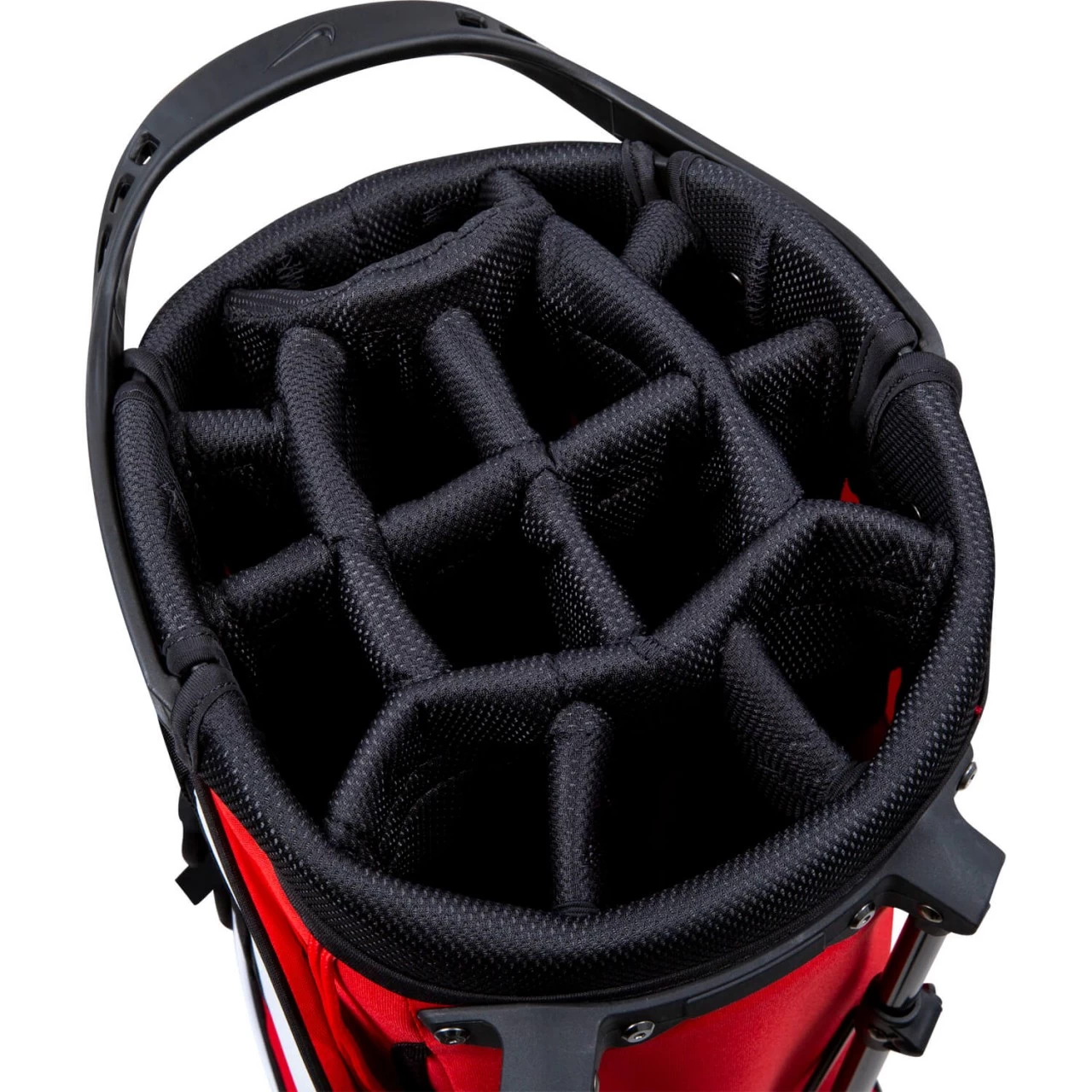 Das Air Hybrid 2 Standbag von Nike bietet mit seinem 14-fach unterteilten Top allen Schlägern Platz, die mit auf die Runde kommen sollen. Equipment findet in den sieben Reißverschlussfächern Platz, zu denen auch ein Kühlfach zählt. Darüber hinaus hat das Bag ein Einschubfach an der Seite, in dem beispielsweise eine zusätzliche Wasserflasche verstaut werden kann. Hinzu kommen Regenschirmhalter, Stift- und Handschuhhalter.
