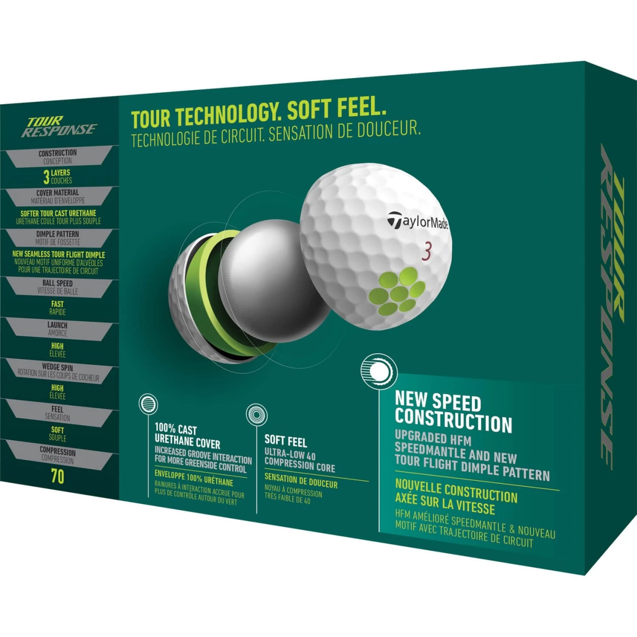 Der Hi-Spring Kern mit einer niedrigen Kompression (70) sorgt für ein weiches Gefühl, ohne Ballgeschwindigkeiten einzubüßen. Die dreischichtige Konstruktion des Tour Response wurde entwickelt, um den Energietransfer zu maximieren und schnelle Ballgeschwindigkeiten zu generieren. Der neue Speedmantle™ mit HFM umgibt den Kern und verhilft dem Ball zu einem explosiven Start im Treffmoment.