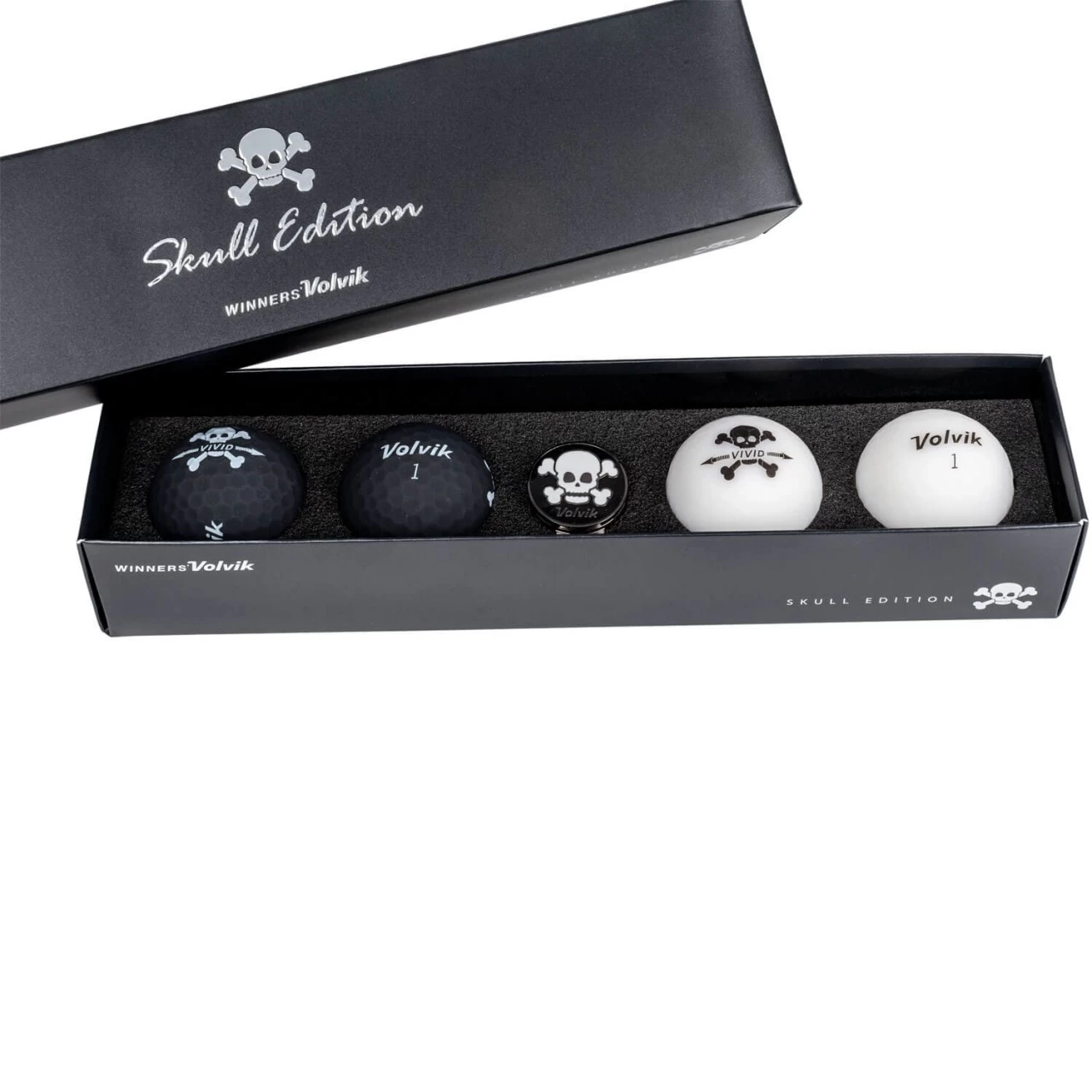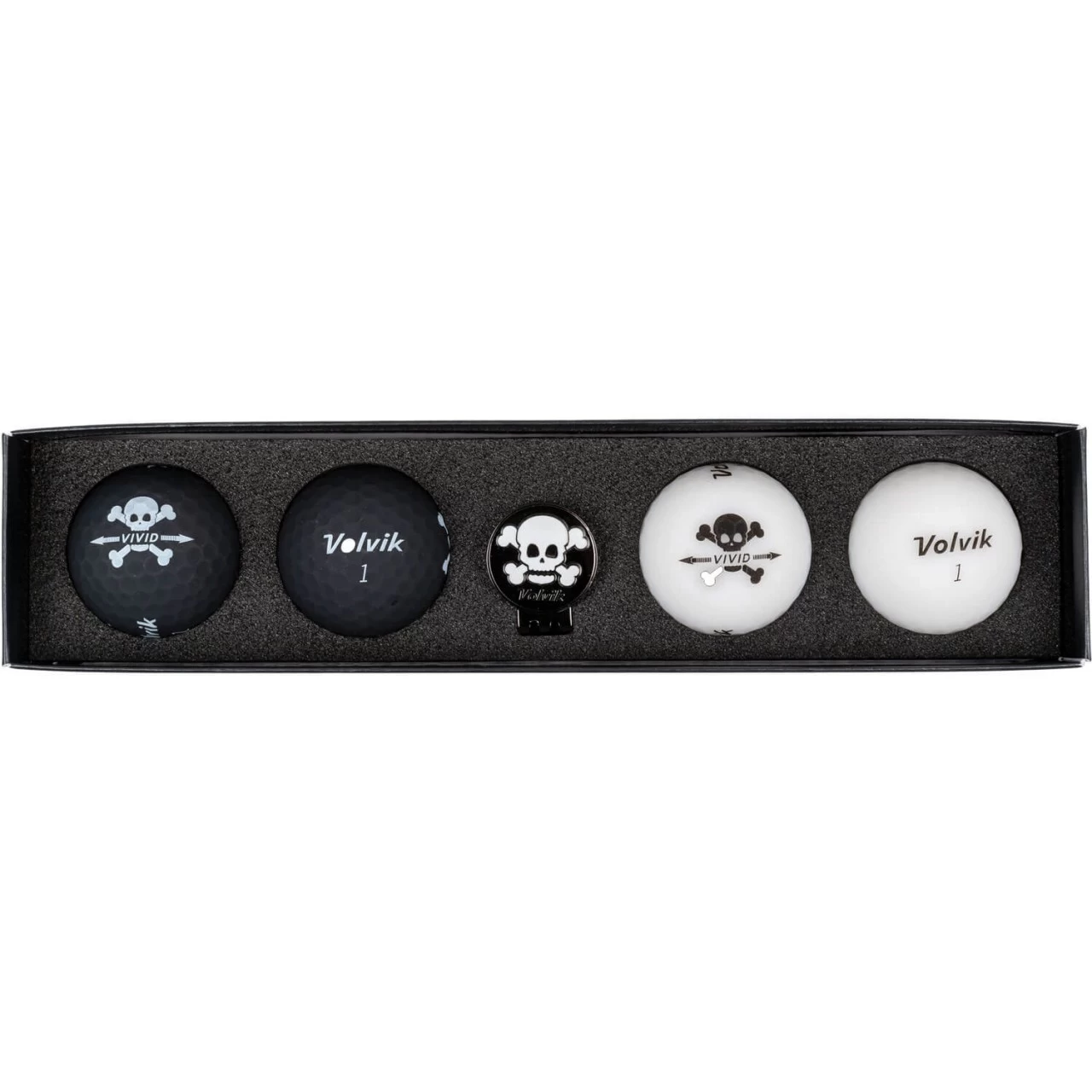 Dieses Geschenkset enthält 4 Volvik Vivid Golfbälle in einer einzigartigen, limitierten Skull-Edition mit Totenschädel Motiv und einem Ballmarker, ebenfalls mit Totenschädel Motiv.